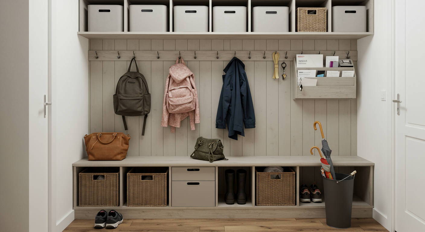 A mudroom collects far more than coats and shoes. It may also be a place where you drop your keys, your mail or the newspaper when coming inside. In rainy seasons, you may also have a wet umbrella on hand. The best way to corral all of these potential items is to have dedicated spaces for each type. For example, have a specific shelf or hook for keys, a wall-mounted mail organizer and a waterproof bucket for wet umbrellas and accessories. This way, you save space and keep everything in its place.